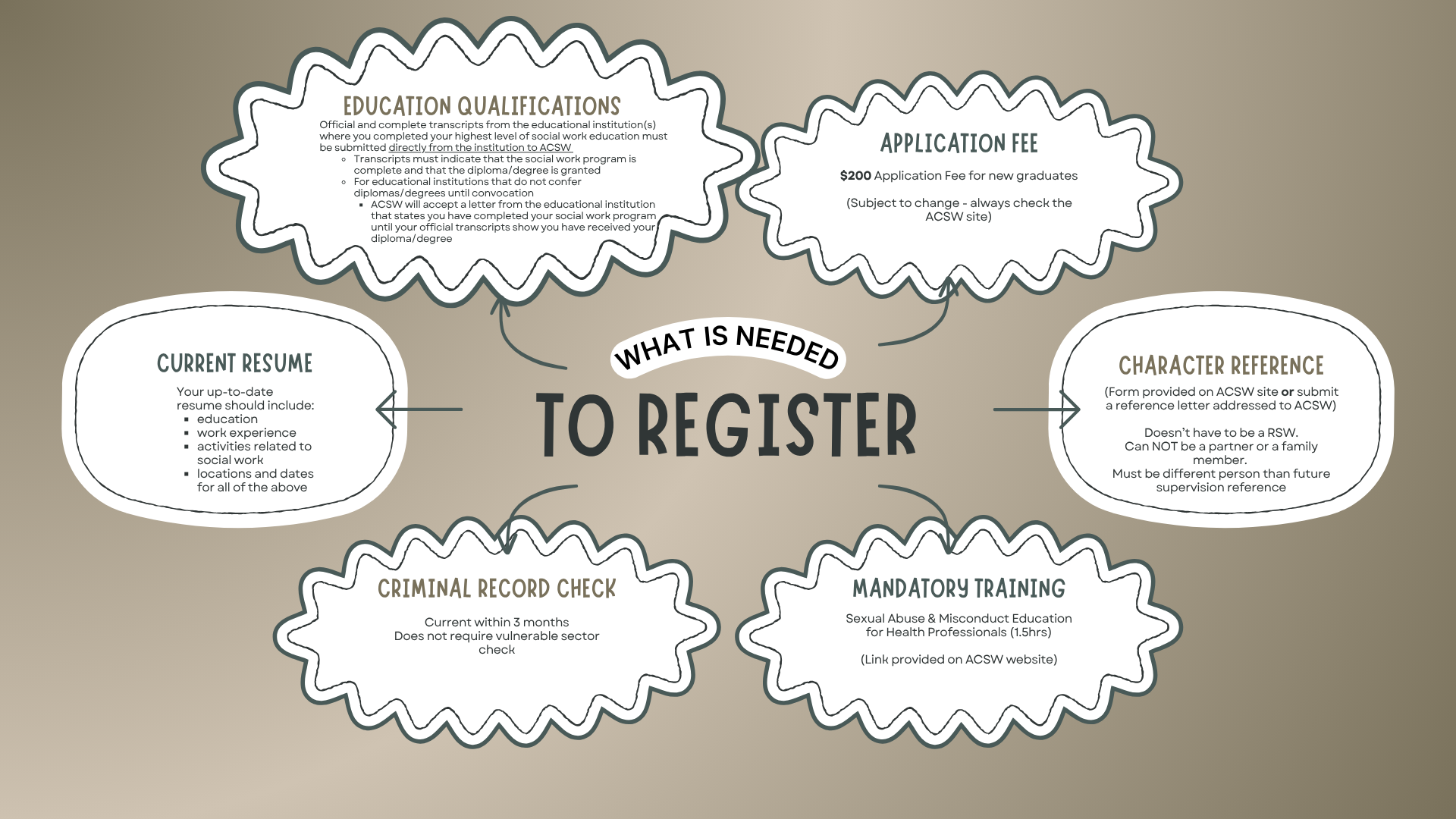 To become a registered social worker you may benefit from getting to know the organization you need to register with. In Alberta this is the Alberta College of Social Workers or ACSW. There is a ton of information on their website, including the registration page which is a great first stop on the road to registration.